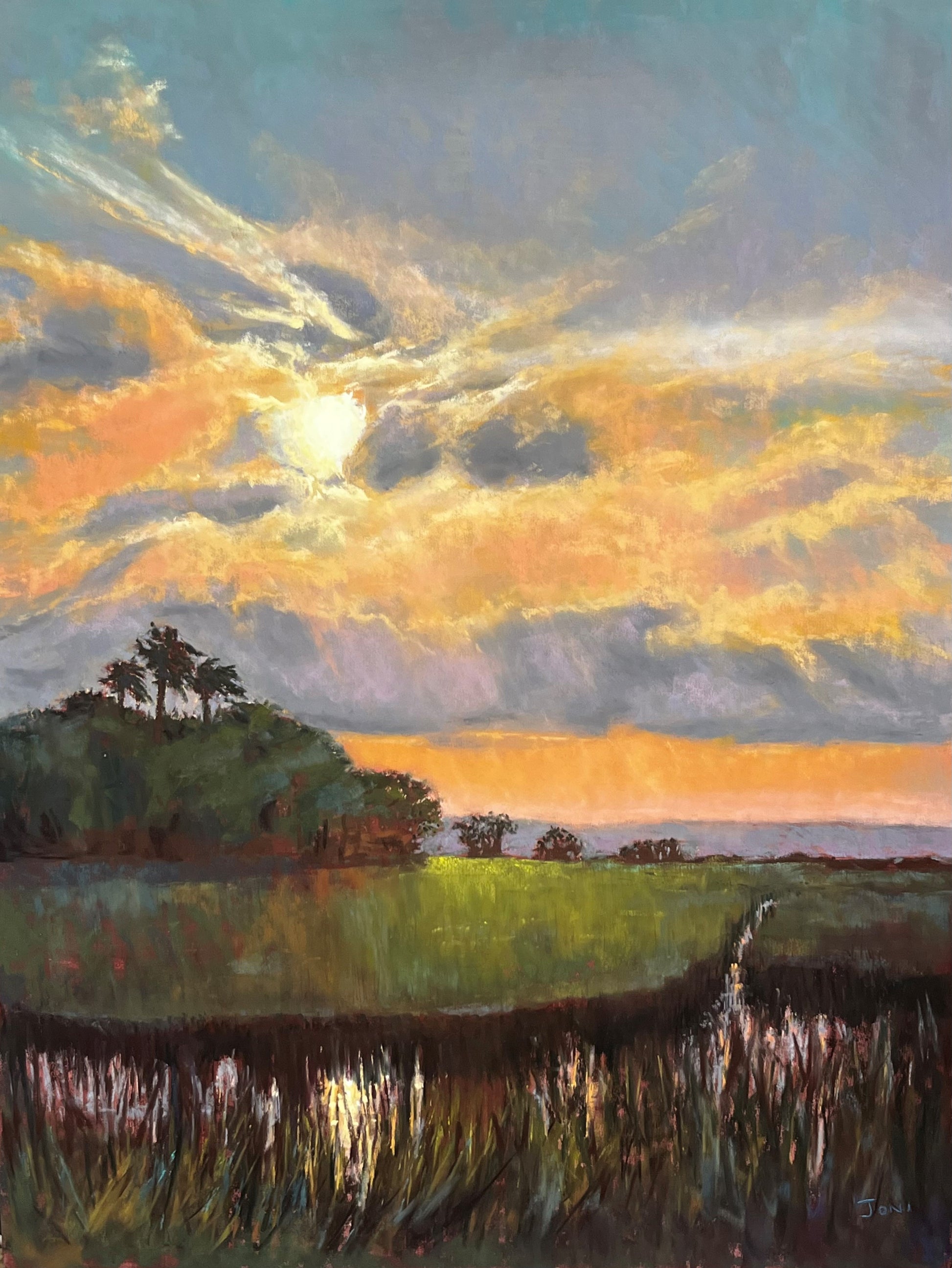Joan’s pastel paintings showcase the beauty that can be found right under our noses, often missed in our day to day. She is particularly taken with meeting places where the land meets the sea, where the clouds meet the water, or where the sun touches the grass. The intersection of these natural forces creates the energy and light Joan so expertly captures.