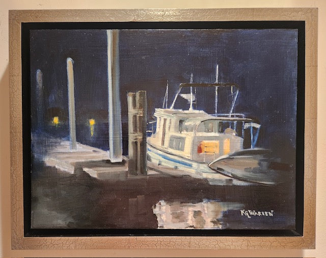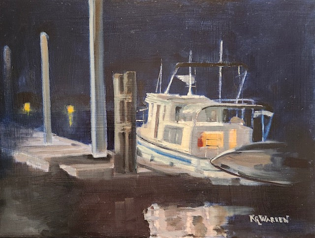 Standing on the Dewees Ferry dock at night is a magical experience where lights bounce off boats, piers, and walkways. The contrast between the white boat and the inky night color is very appealing. It will look all different in the morning.